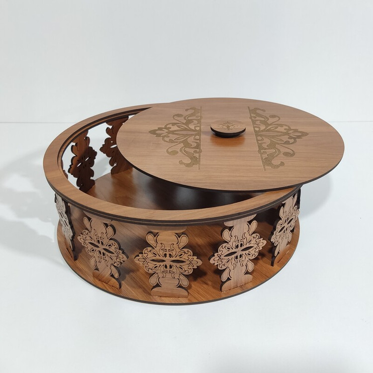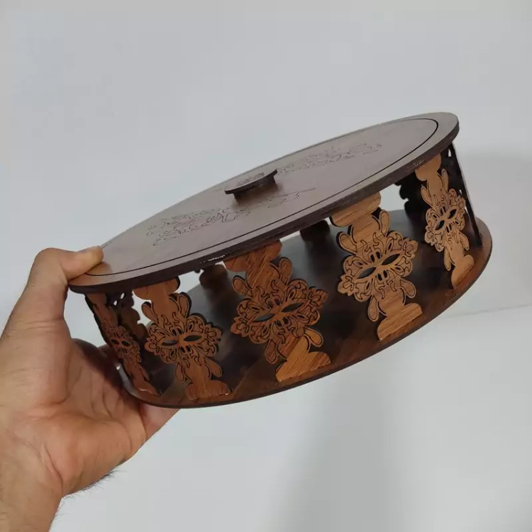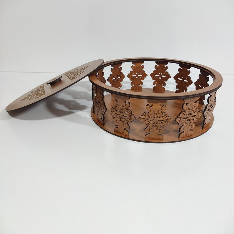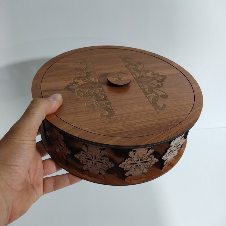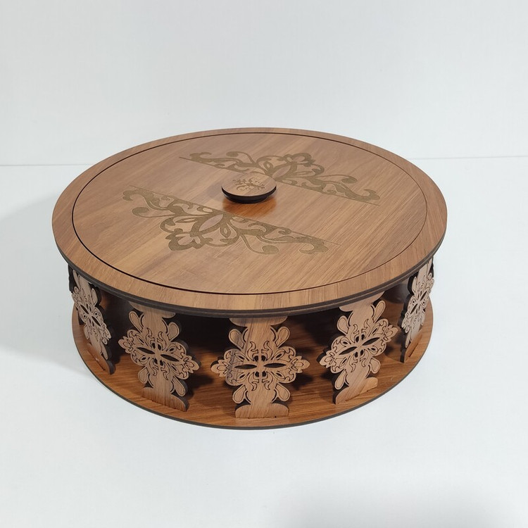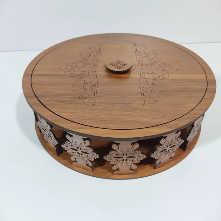 ظرف دایره ای فینگر فود داری درب و طرح زیبا و دیواره های جذاب با طرح و نقش اسلیمی که برش خورده است ، که با چوب ام دی اف دو رو تولید شده است.