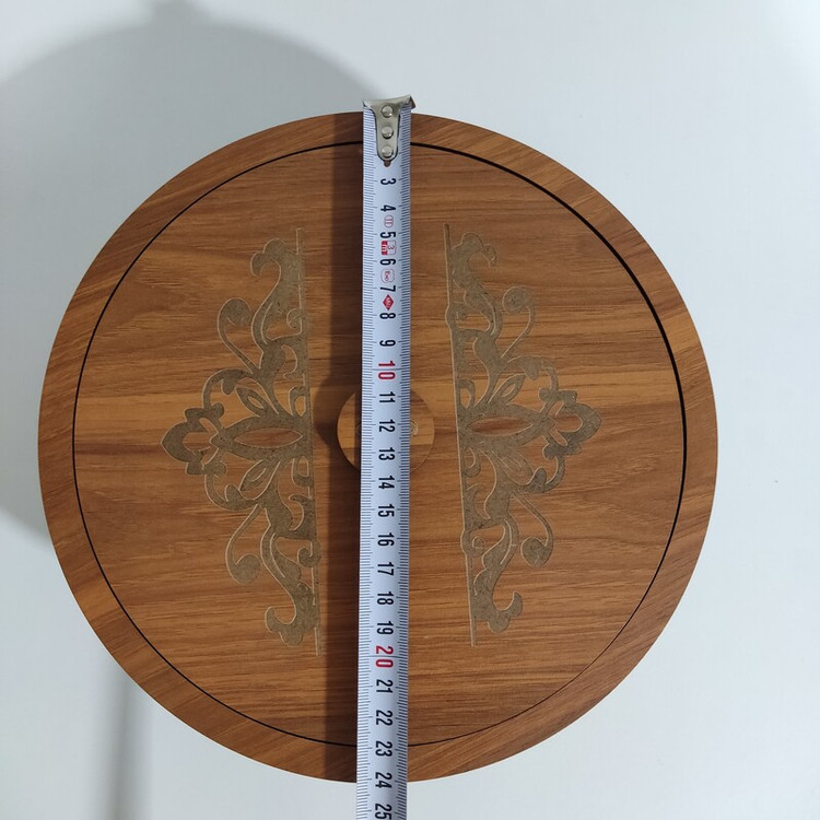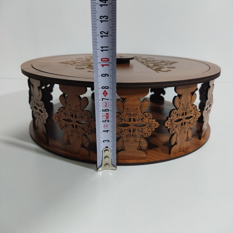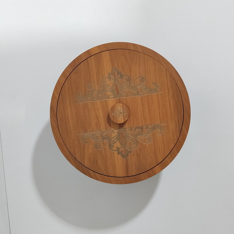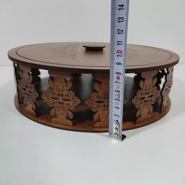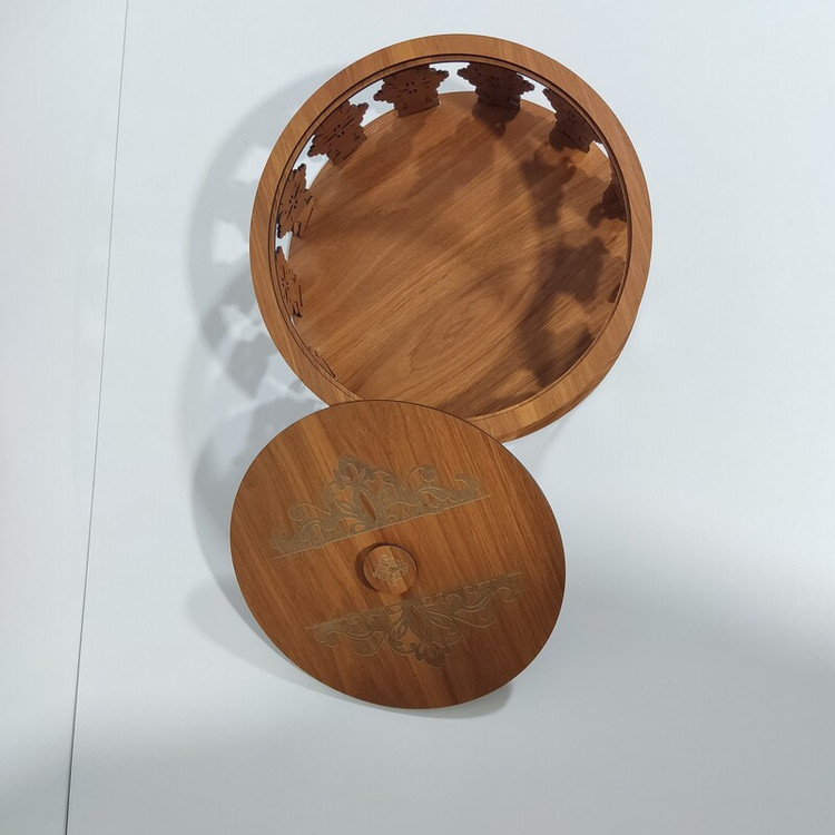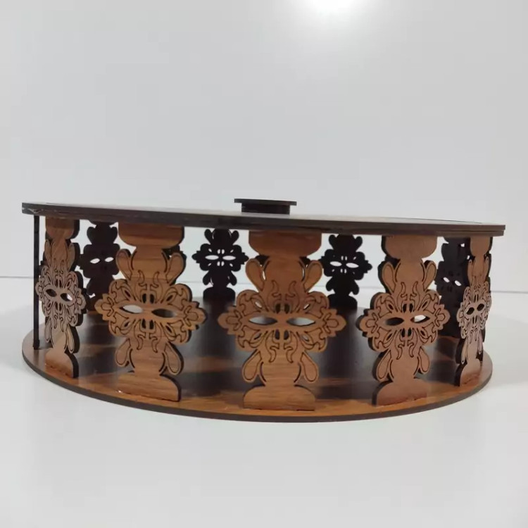 ظرف دایره ای فینگر فود داری درب و طرح زیبا و دیواره های جذاب با طرح و نقش اسلیمی که برش خورده است ، که با چوب ام دی اف دو رو تولید شده است.