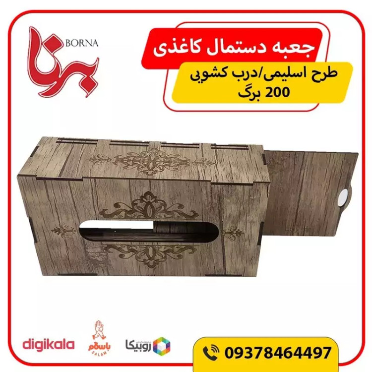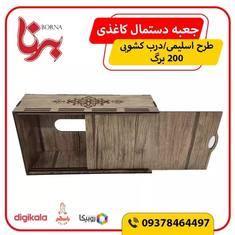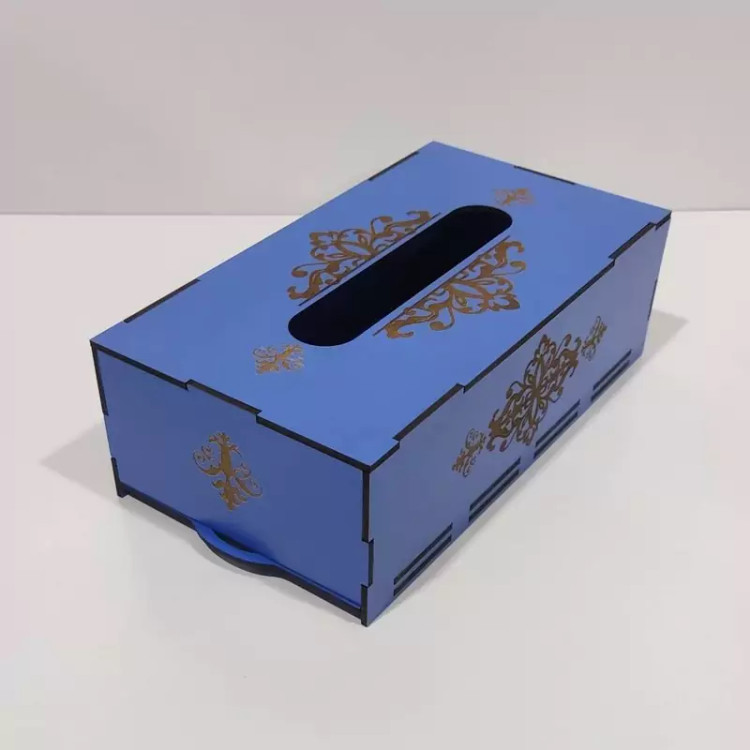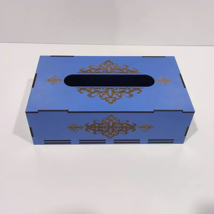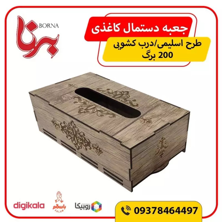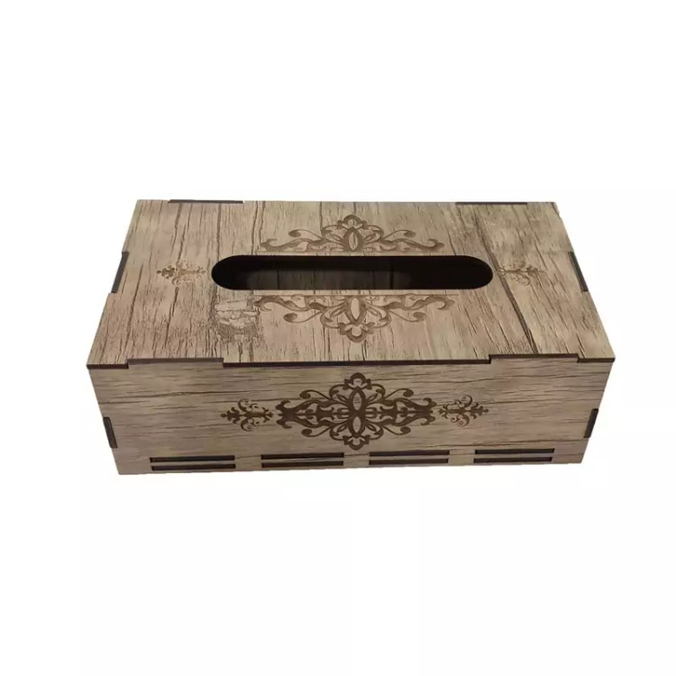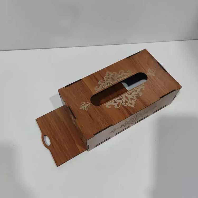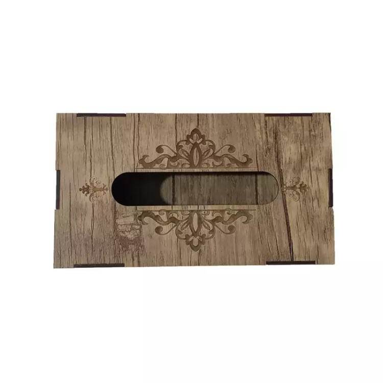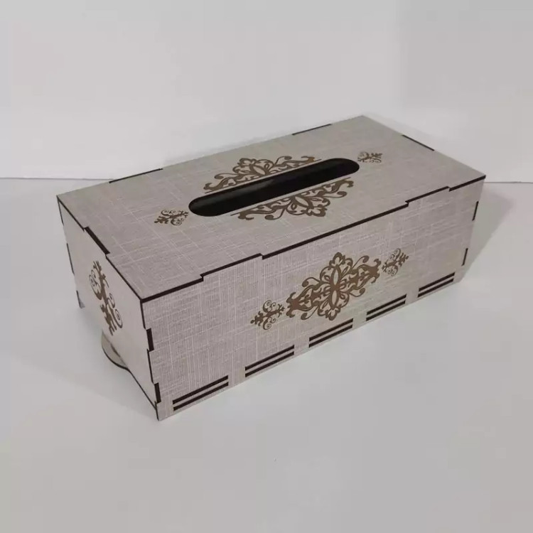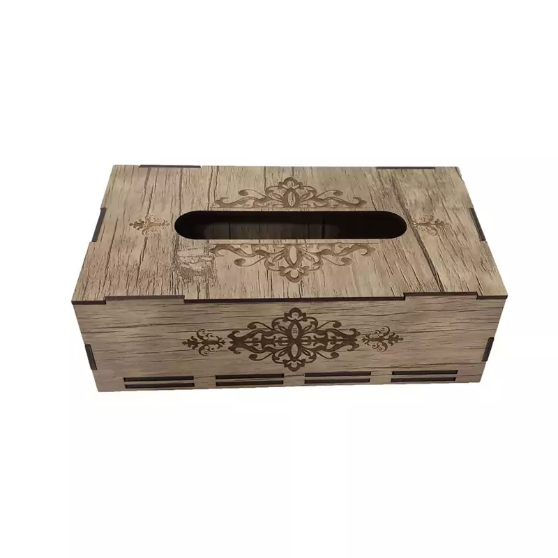 جعبه دستمال کاغذی چوبی با نقش های حکاکی شده بر روی آن جلوه ی خیلی زیبایی به میز های پذیرایی و سفره های ما می دهد این جعبه کاملا از چوب ام دی اف ساخته شده و قسمت تعویض دستمال کاغذی به صورت کشویی از پایین جعبه می باشد که تعویض پک دستمال را آسان تر کرده است این جعبه برای دستمال کاغذی های با بسته بندی های پلاستیکی و اقتصادی مناسب می باشد و گنجایش پک های 200 برگی دستمال را دارد فضای بالای جعبه محل خارج شدن دستمال با اندازه مناسب بوده و در زمان استفاده به راحتی دستمال از جعبه بیرون می آید و پاره نمیشود از این جعبه دستمال کاغذی میتوان در خانه ، میز پذیرایی، هتل ها ، رستوران ها ، کافه ها ، آرایشگاه ها استفاده کرد