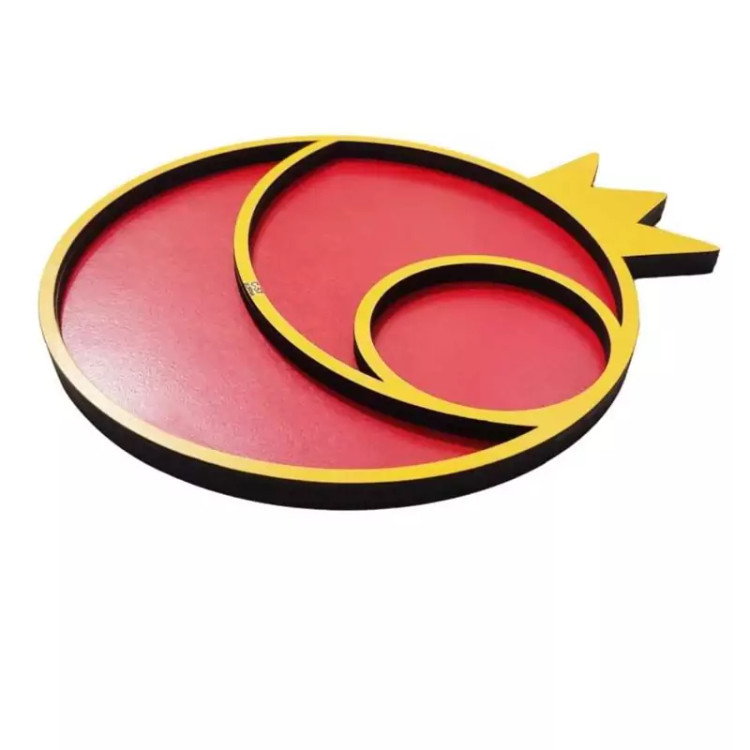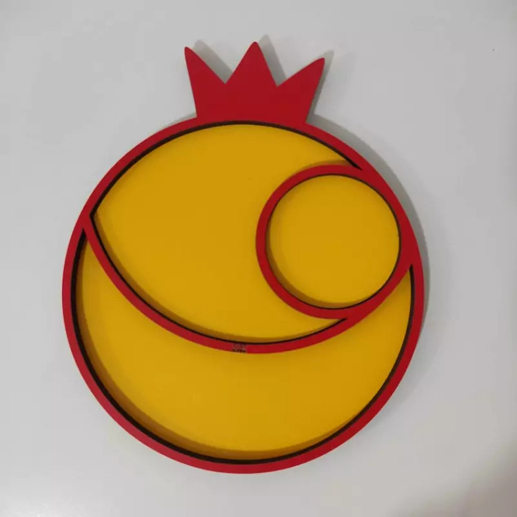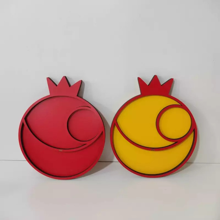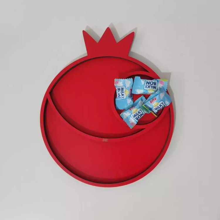 این محصول زیبا از ۴لایه ام دی اف ۳mm ساخته شده است که لایه اول کف آن میباشد و ۳لایه دیگر که به شکل انار هستند و برش خوردهاند قسمت های مختلف این اردوخوری را تشکیل دادند، که شما عزیزان میتوانید تنقلات خشک و کوچک و یا نقل و نبات یا شکلات و آبنبات و شیرینی های خشک را در این ظرف قرار داده و با آن از خود و مهمانانتان پذیرایی کنید.