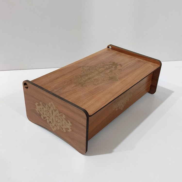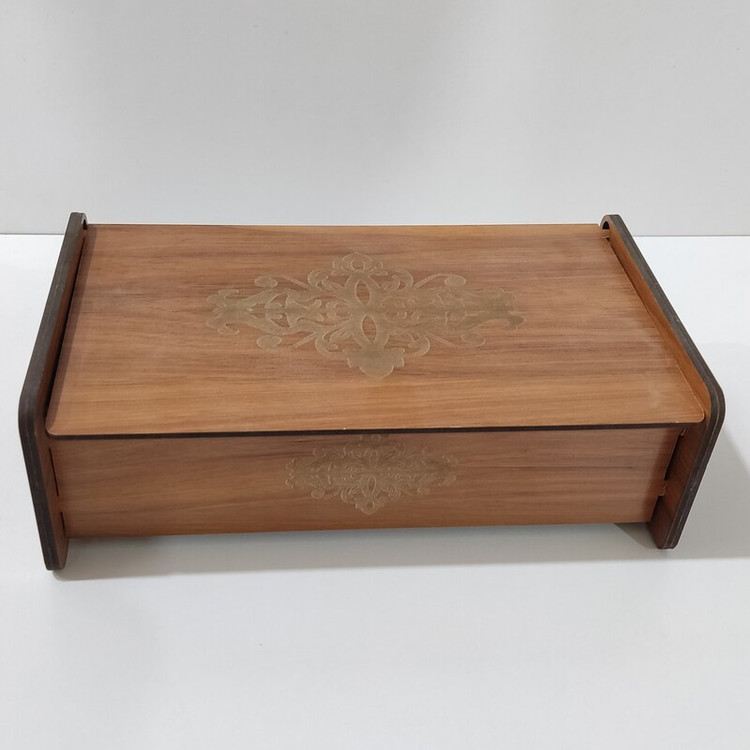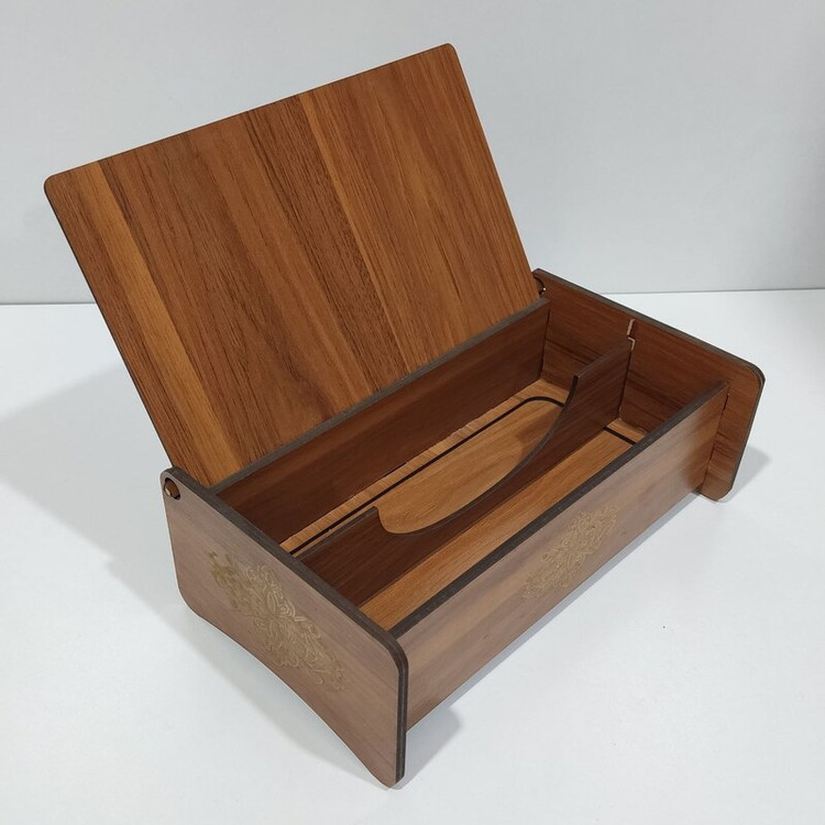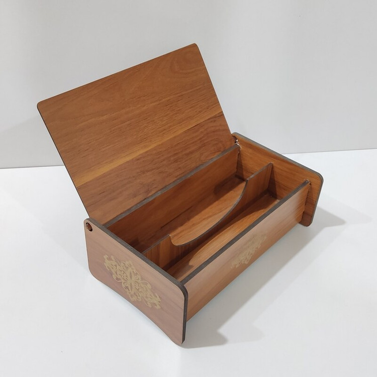 این جا قاشق چنگالی دارای حکاکی زیبا و روی بدنه و قسمت جدا کننده و درب است فضای داخلی این جاقاشقی دو قسمتی است و امکان قراردادن قاشق و چنگال به صورت تفیک شده وجود دارد جنس جا قاشق چنگالی از چوب ام دی اف میباشد و همین نکته باعث شده تا تمیز کردن این محصول خیلی راحت انجام گیرد این محصول زیبا را میتوانید برروی میز پذیرایی و سر سفره های خود داشته باشید و قاشق ها و چنگال ها را منظم و دسته بندی شده نگهداری کنید