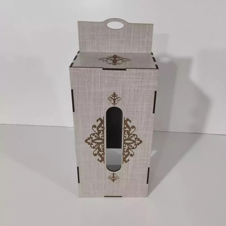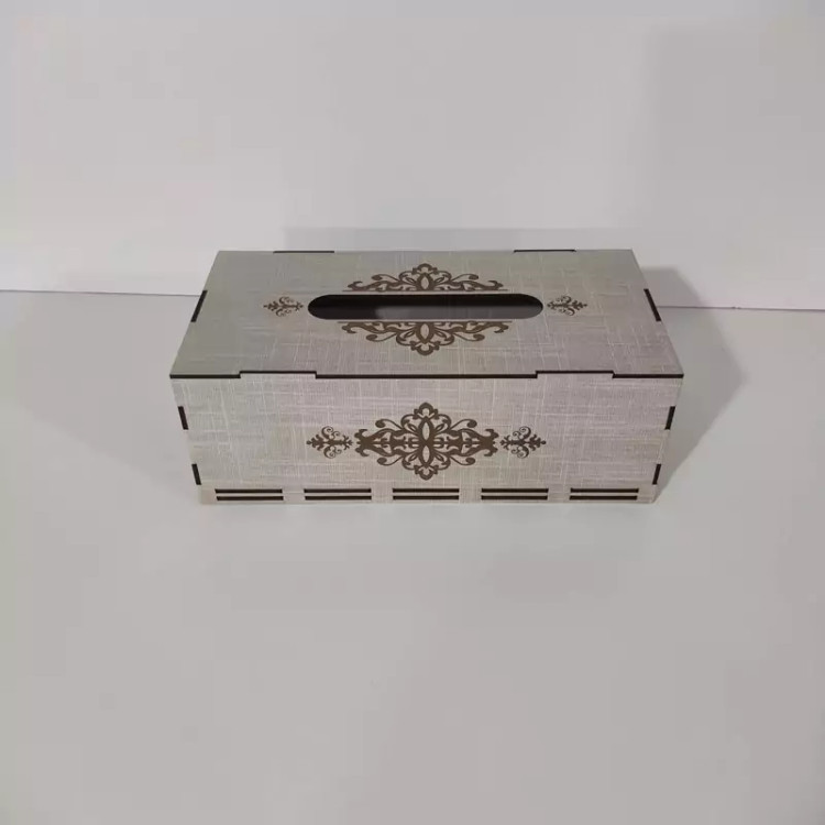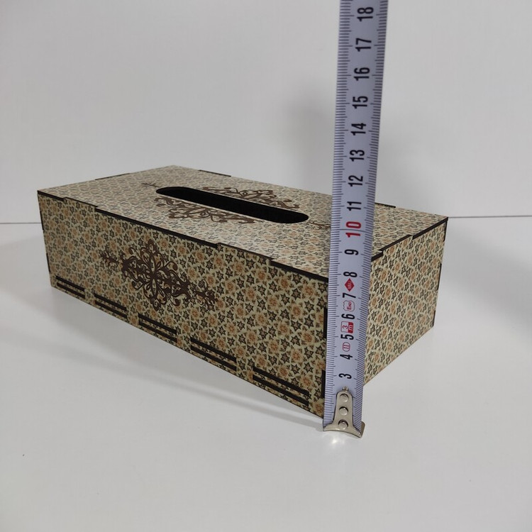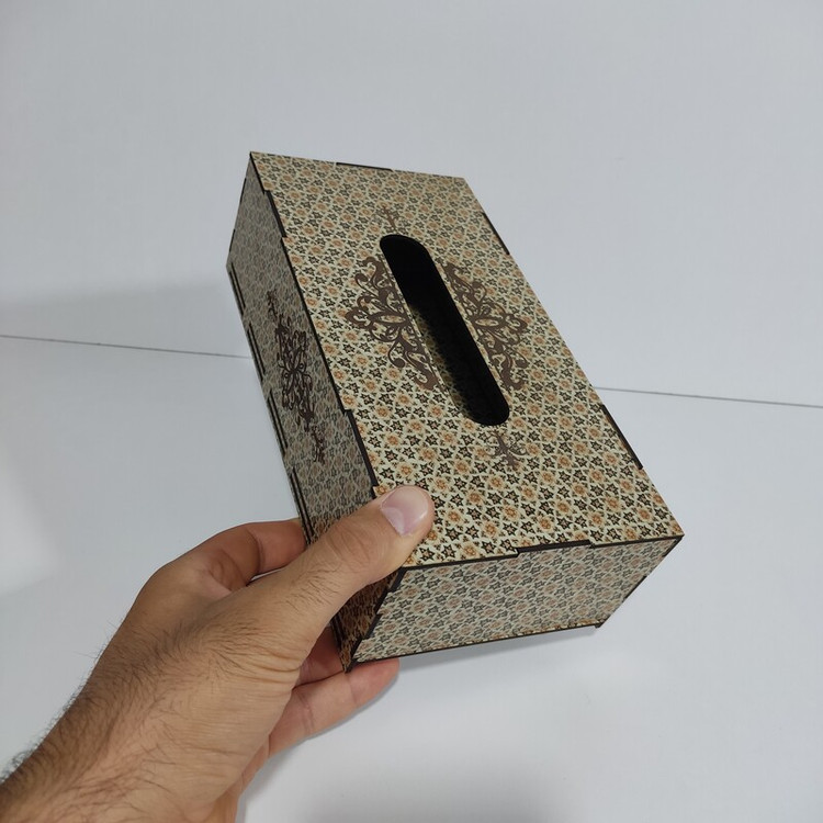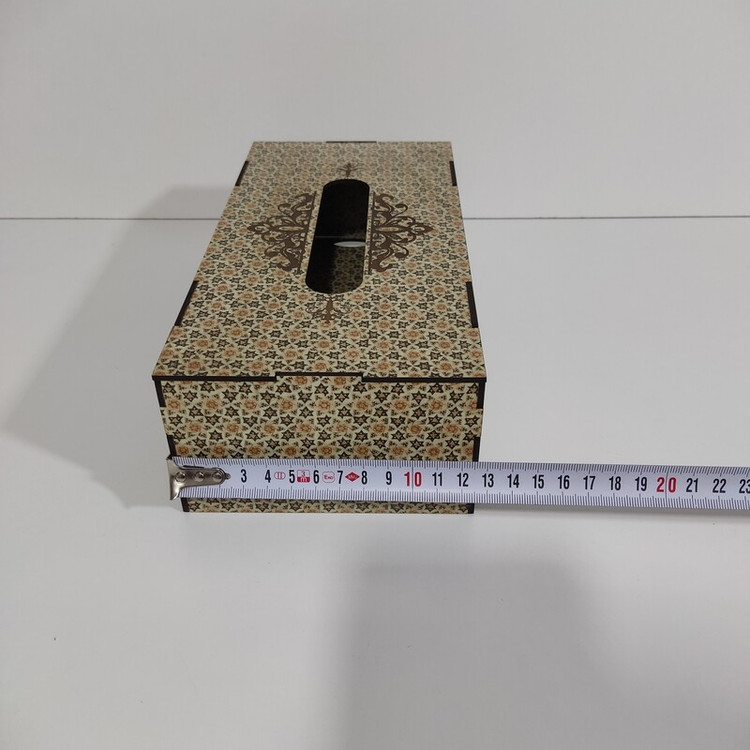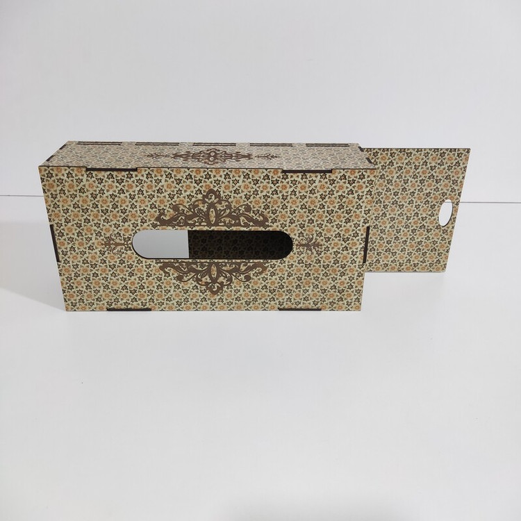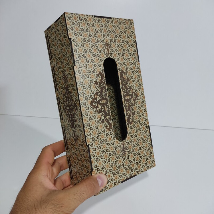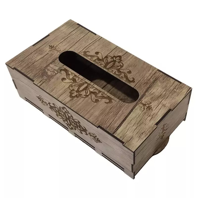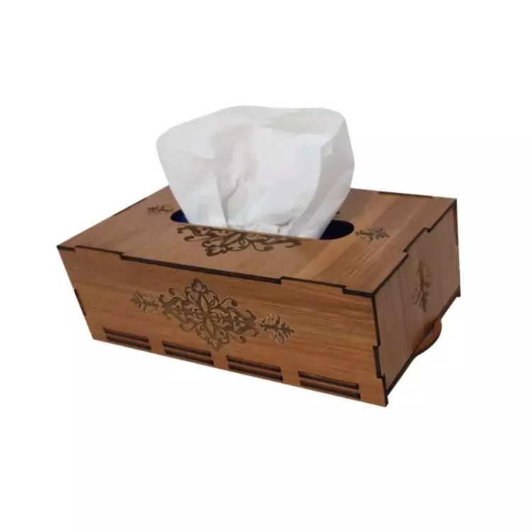 جعبه دستمال کاغذی چوبی با نقش های حکاکی شده بر روی آن جلوه ی خیلی زیبایی به میز های پذیرایی و سفره های ما می دهد این جعبه کاملا از چوب ام دی اف ساخته شده و قسمت تعویض دستمال کاغذی به صورت کشویی از پایین جعبه می باشد که تعویض پک دستمال را آسان تر کرده است این جعبه برای دستمال کاغذی های جعبه ای 200برگ مناسب میباشد و همچنین برای دستمال کاغذی های با بسته بندی های پلاستیکی و اقتصادی نیز مناسب می باشد و گنجایش پک های 200 برگی دستمال را دارد فضای بالای جعبه محل خارج شدن دستمال با اندازه مناسب بوده و در زمان استفاده به راحتی دستمال از جعبه بیرون می آید و پاره نمیشود از این جعبه دستمال کاغذی میتوان در خانه ، میز پذیرایی، هتل ها ، رستوران ها ، کافه ها ، آرایشگاه ها استفاده کرد