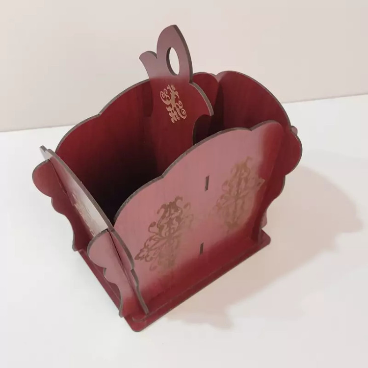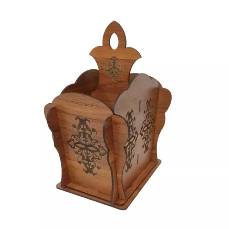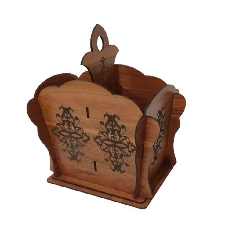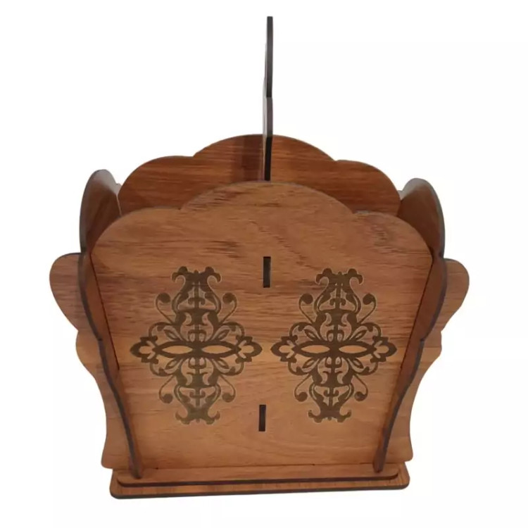 این جا قاشق چنگالی دارای حکاکی زیبا و روی بدنه و قسمت جدا کننده و دستگیره است فضای داخلی این جاقاشقی دو قسمتی است و امکان قراردادن قاشق و چنگال به صورت تفیک شده وجود دارد جنس جا قاشق چنگالی از چوب ام دی اف میباشد و همین نکته باعث شده تا تمیز کردن این محصول خیلی راحت انجام گیرد این محصول زیبا را میتوانید برروی میز پذیرایی و سر سفره های خود داشته باشید و قاشق ها و چنگال ها را منظم و دسته بندی شده نگهداری کنید