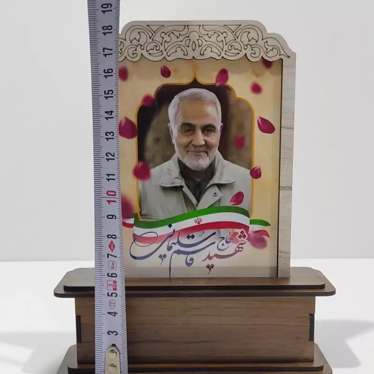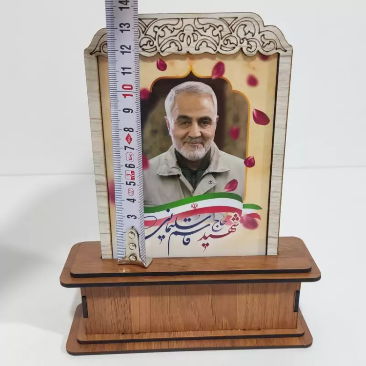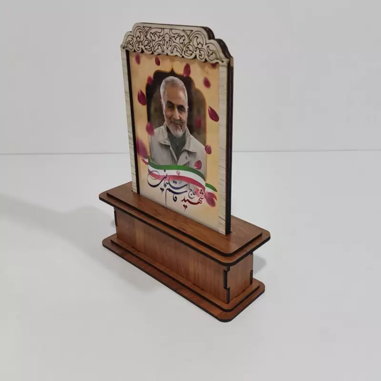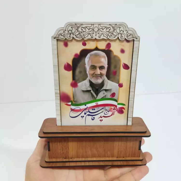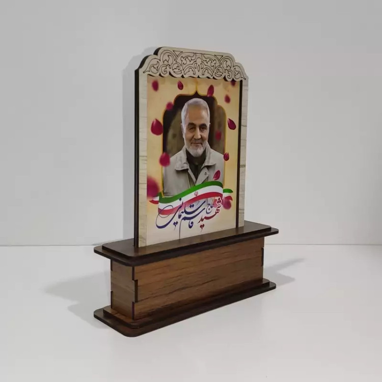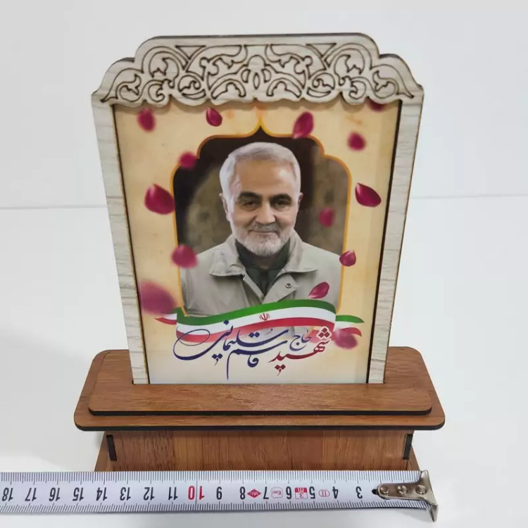 تندیس سردار شهید حاج قاسم سلیمانی ساخته شده با چوب mdf با ابعادی معمولی جهت استفاده روی میز کار، روی میز تلویزیون و حتی مناسب هدیه دادن