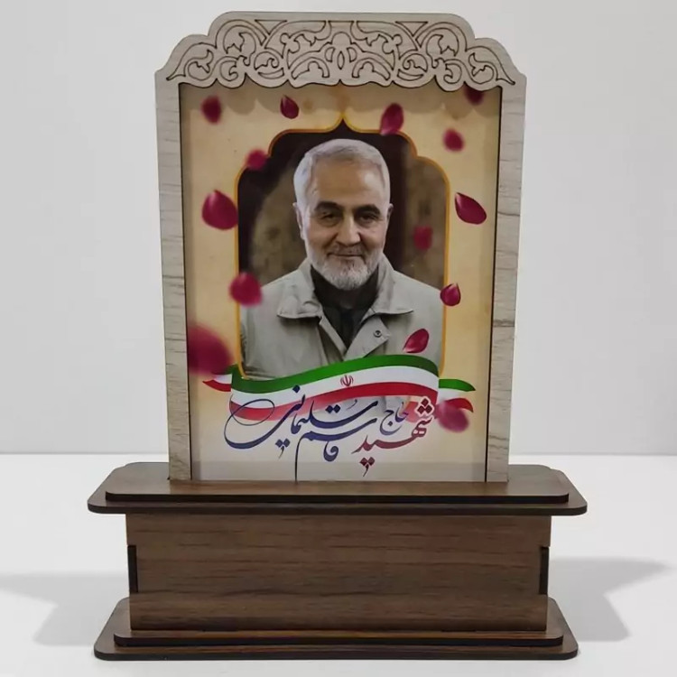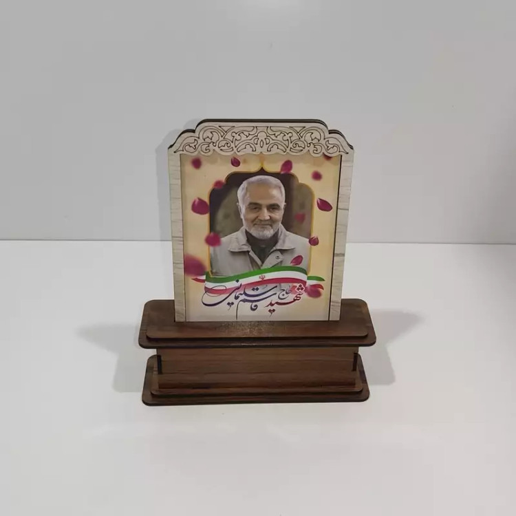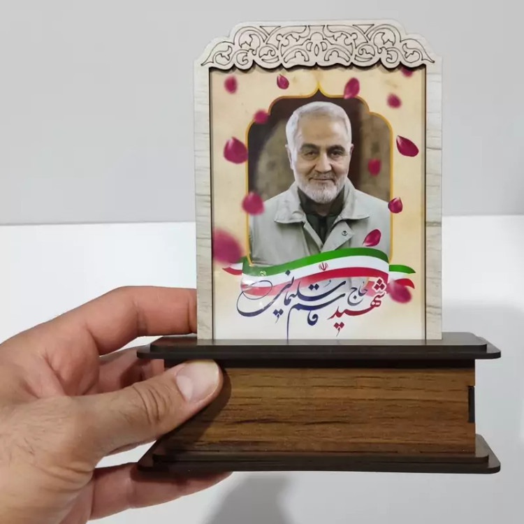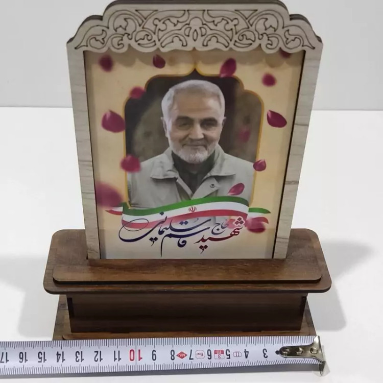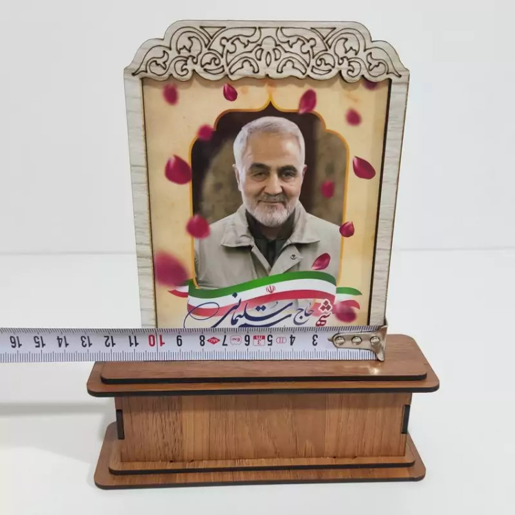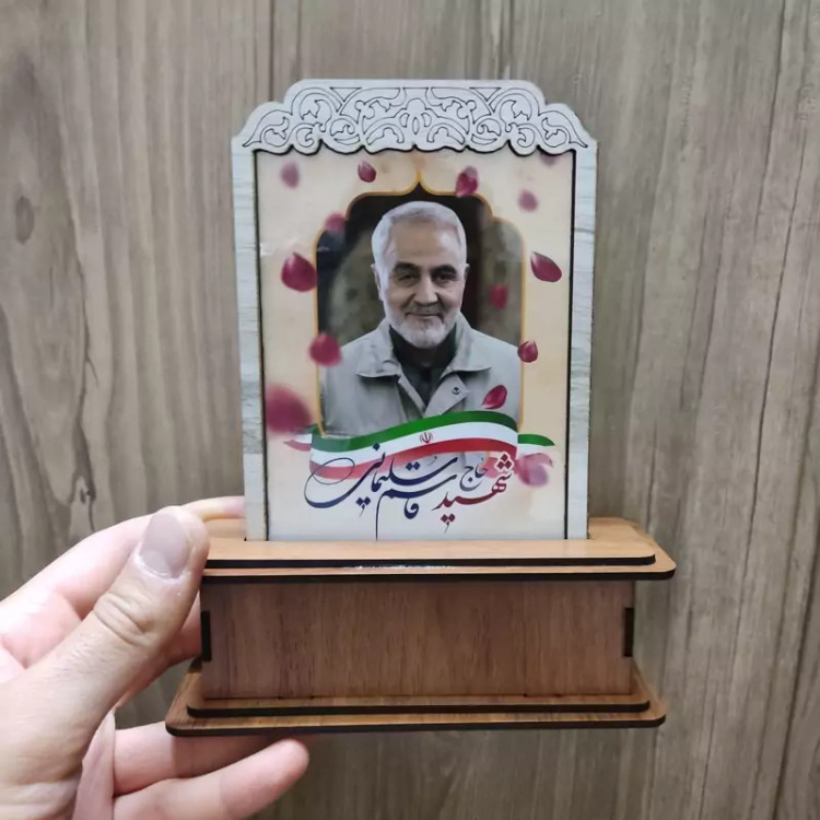 تندیس سردار شهید حاج قاسم سلیمانی ساخته شده با چوب mdf با ابعادی معمولی جهت استفاده روی میز کار، روی میز تلویزیون و حتی مناسب هدیه دادن