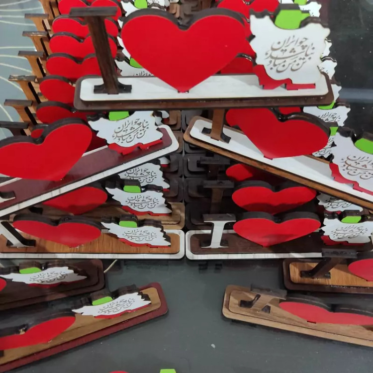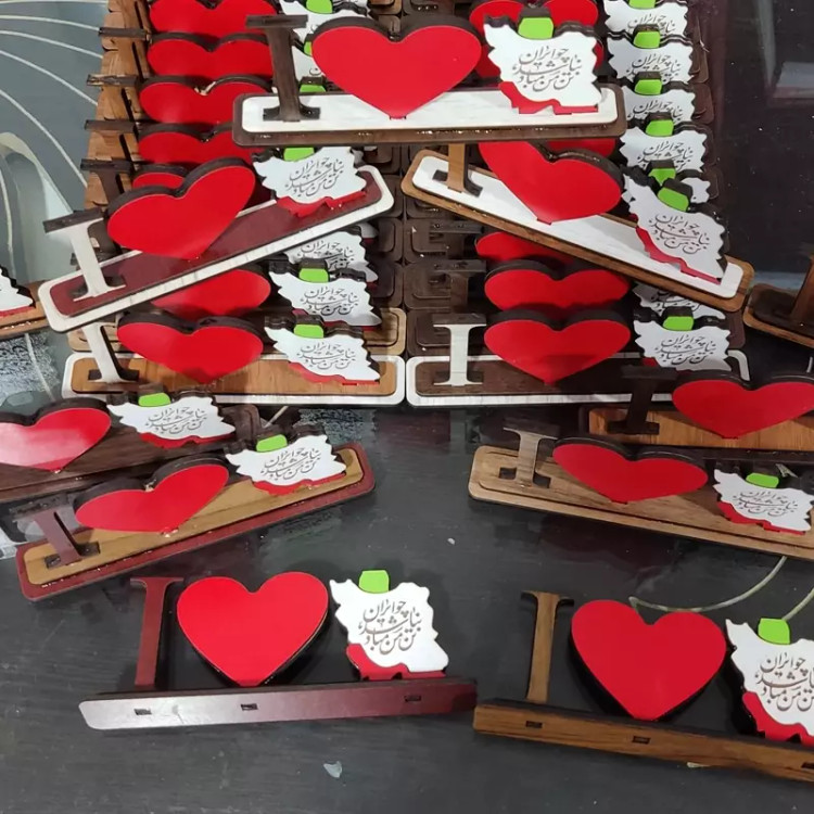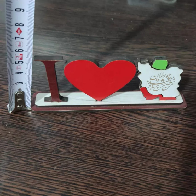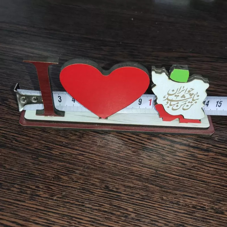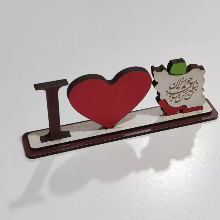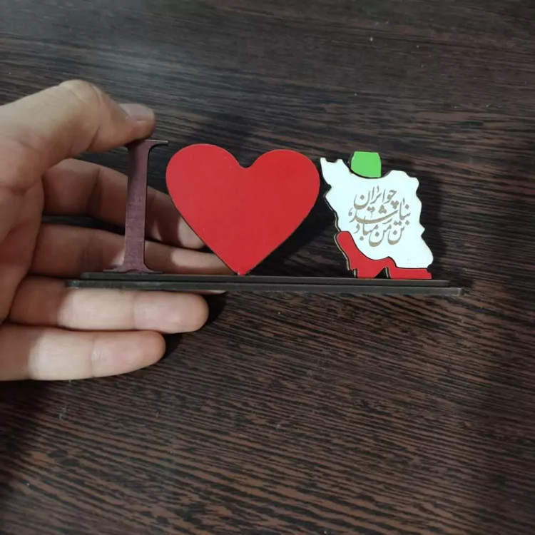 مینی استند رومیزی دوستت دارم ایران (I Love Iran) چوبی - با حک شعر (چو ایران نباشد تن من مباد)