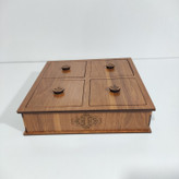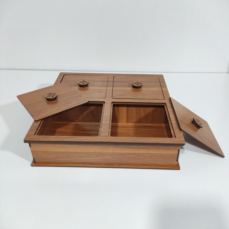 این آجیل خوری 4 قسمتی با درب چوبی و نقوش بر روی دیواره ها و دستگیره ها می باشد و از جنس چوب ام دی اف ساخته شده در وسط این آجیل خوری دیواره های تقسیم کننده وجود دارد که فضا های آجیل خوری را به چهار قسمت مساوی تقسیم میکند این آجیل خوری را میتوان در خانه، سرکار، میهمانی ها، ادارات، هتل ها، کافه ها استفاده کرد و در هر قسمت آن شکلات یا آجیل های مختلف ریخت.