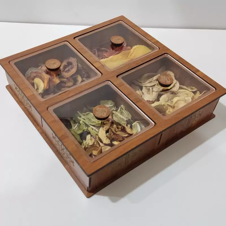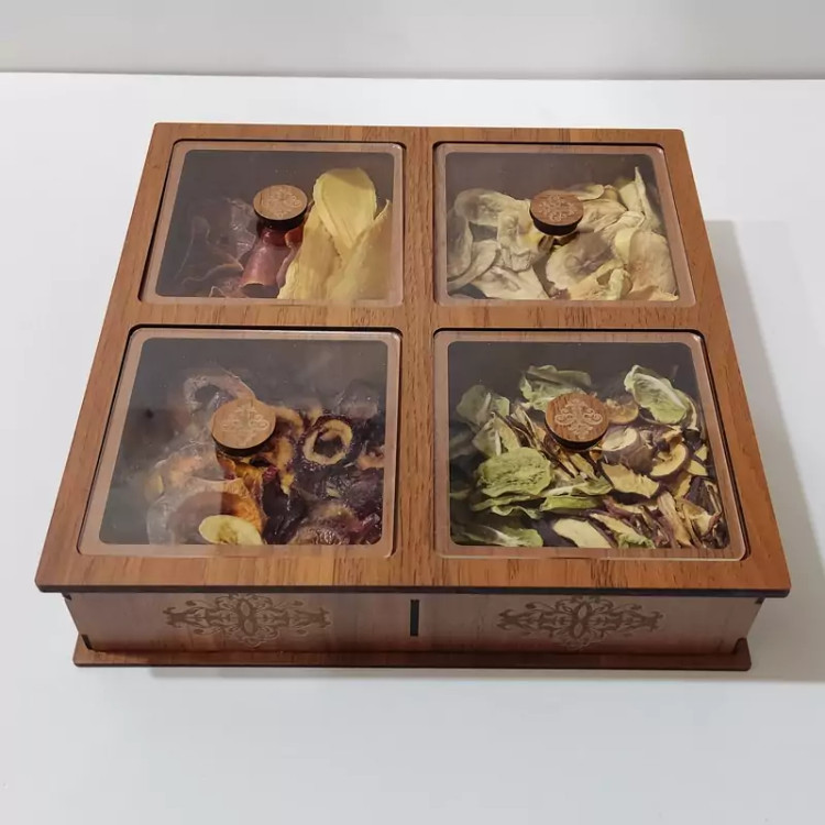 این آجیل خوری 4 قسمتی با درب پلکسی شفاف و حکاکی نقوش بر روی دیواره ها و دستگیره ها می باشد و از جنس چوب ام دی اف ساخته شده در وسط این آجیل خوری دیواره های تقسیم کننده وجود دارد که فضا های آجیل خوری را به چهار قسمت مساوی تقسیم میکند این آجیل خوری را میتوان در خانه، سرکار، میهمانی ها، ادارات، هتل ها، کافه ها استفاده کرد و در هر قسمت آن شکلات یا آجیل های مختلف ریخت.